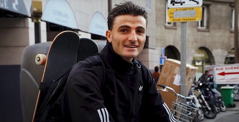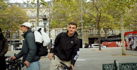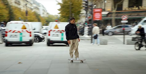 We spent a lot of time not paying attention to Vincent Milou. We don’t follow the contest circuit, of which Vincent is a dominant part, and we certainly didn’t give any attention to Pizza Skateboards when they were still around, so Vincent fell squarely into one of our many blind spots. This week, Pocket featured Vincent on their terrific “Followed” series, and we were pleasantly surprised to find out that Vincent is a humble chiller with a great attitude and even better style. Seeing him cycling through Paris and hitting spots with his homies fresh off his SLS win was a lovely view. Of course his skating is great, but we were struck by his excellent outfit. He took the Paris streets in a crisp black adidas trackie paired with pleated khakis and Superstars - simple, clean, and perfectly baggy. He’s in the running for skateboarding’s best hair, and it stayed fresh throughout a day of skating and cycling. Vincent recently joined the heavy-hitters on Element’s European squad and we’re no doubt in for a banging new chapter in his career. We’ll be paying attention from now on!
