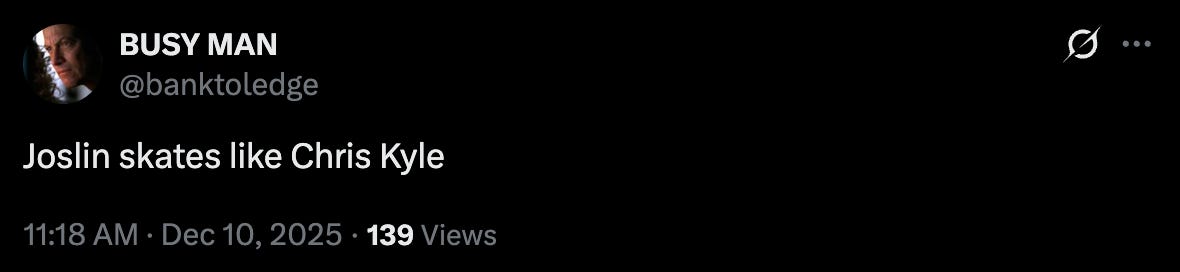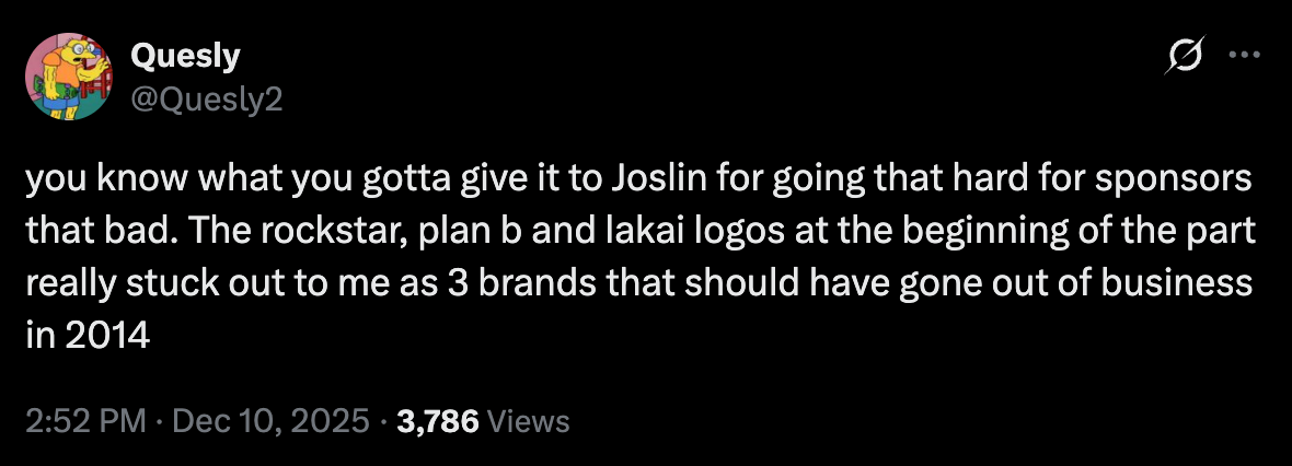 Has Joslin watched any #content in the last 5 years, or does he really just go out and hunt hammers when he’s not getting jacked or competing at Street League? Does he know he got kicked off Etnies because they’re trying to be cool and relevant and he’s neither? It’s like he parachuted into 2025 straight from his 2014 debut, unaware of skateboarding’s metamorphosis in the ensuing years. He’s a caricature down to his laughable list of sponsors: Lakai (stolen from the founders by a venture capitalist, whole team kicked off to focus on moving units through Amazon, then the skate program revived by a Youtuber), Rockstar Energy (the worst energy drink sponsor), and Plan B Skateboards (lol).