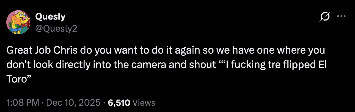 The Tapped In Tastemakers lambasted Joslin’s post-tre celebration, while the I Used To Skaters responded with stuff like “I’d like to see YOU tre flip El Toro!” TWR backs some tooting of your own horn when you put down something you’re proud of, but his celebration was hilariously cringe. No, we’ve never tre flipped El Toro (or even tre flipped!), but we know we would not say “I fucking tre flipped El Toro” and take our shirt off and flex our muscles (we don’t have any!). Next, his children rushed in to hug their father like a returning war hero. A moment that could’ve been heartwarming instead felt like it was Made For TV, especially after the intro clip showing him warming up for the trick by performing pushups with the kids on his back. The wannabe Joslin Family Vloggers appear to be seeking virality with them, begging for his crowning achievement to be picked up by some Facebook aggregator page called “Heartwarming Human Moments2.” We love kids, but we think you should leave them at home when you’re attempting something that could go horribly wrong and scar them for life. If you insist on bringing them, keep them out of your footage (unless they do something tight)!
