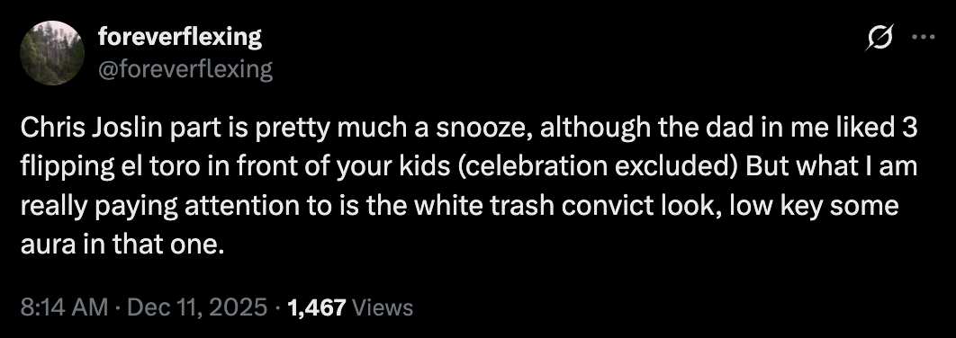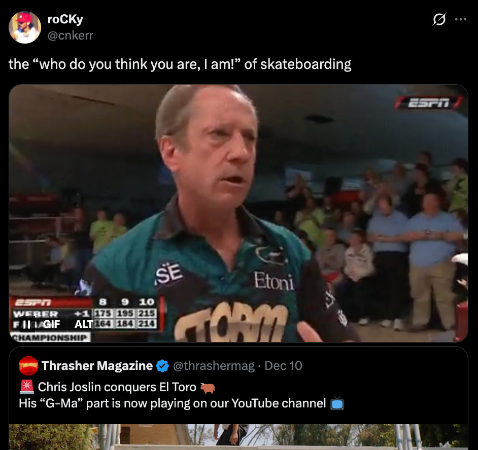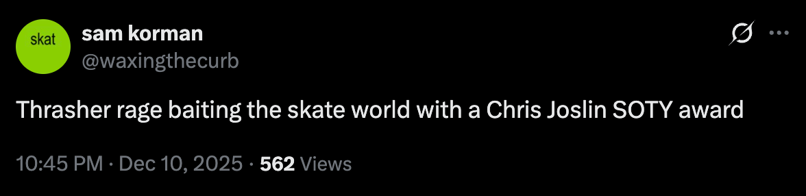 The homies on Mostly Skate debated this year’s SOTY, and contended that the award should be representative of skateboarding in the year it’s handed out. We agree wholeheartedly, because what does Skater of the Year mean if that skater is completely divorced from the beating heart of skateboarding culture? Rusty has always been awarded on vibes, especially when it was given by The Phelper (RIP), and not minutes of footage or contest wins or NBDs. The Skaterati has certainly zoned in on their top two for 2025 - Antonio Durao and Tom Scharr. Both are pushing the bounds of what’s possible on a skateboard, Tony D with his insane switch prowess and galaxy-brained one-foots and Schaar dragging the entire Vert discipline back into the Skategeist thanks to tricks never thought possible on vert and mega ramps with the casualness one skates a mini ramp. Both are displaying levels of creativity that can only be borne out of total mastery of their craft. Both are innately cool. Both are having fun. Both are worthy of the crown. Chris Joslin is not.