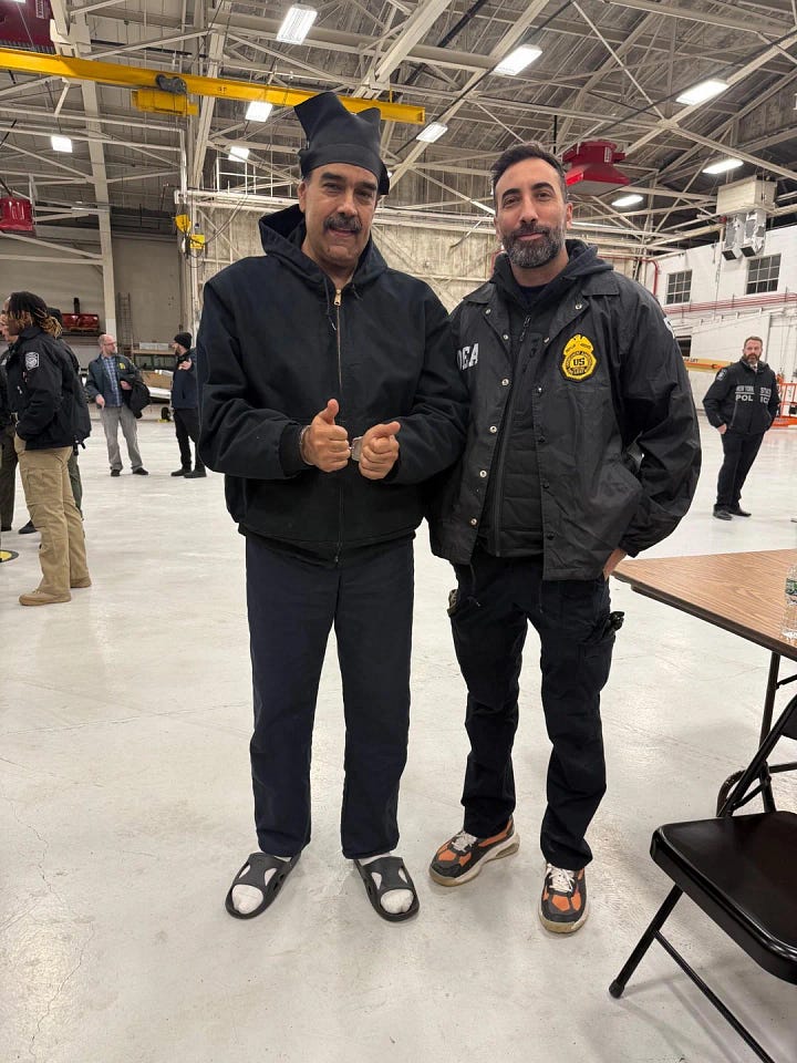 Trump finally invaded Venezuela and kidnapped its president after months of teasing. They paraded Maduro around in various photo ops that only served to benefit the Venezuelan Strong Man as he truly Had That Shit On in more outfit changes than Taylor Swift on the Eras Tour. They caught him in the full Nike Tech, paraded him through New York in a burly black jacket and some kind of swaggy beanie, and finally looking like a Good Ol’ Boy with one of those lightweight hoodies they wear to go fishing and Shit. On Monday, he rolled out in some Carhartt looking like a real Brooklynite. He really put our fellas to shame, holed up at Mar-A-Lago wearing suits and looking at twitter and Shit at 2am like some real swagless assholes!