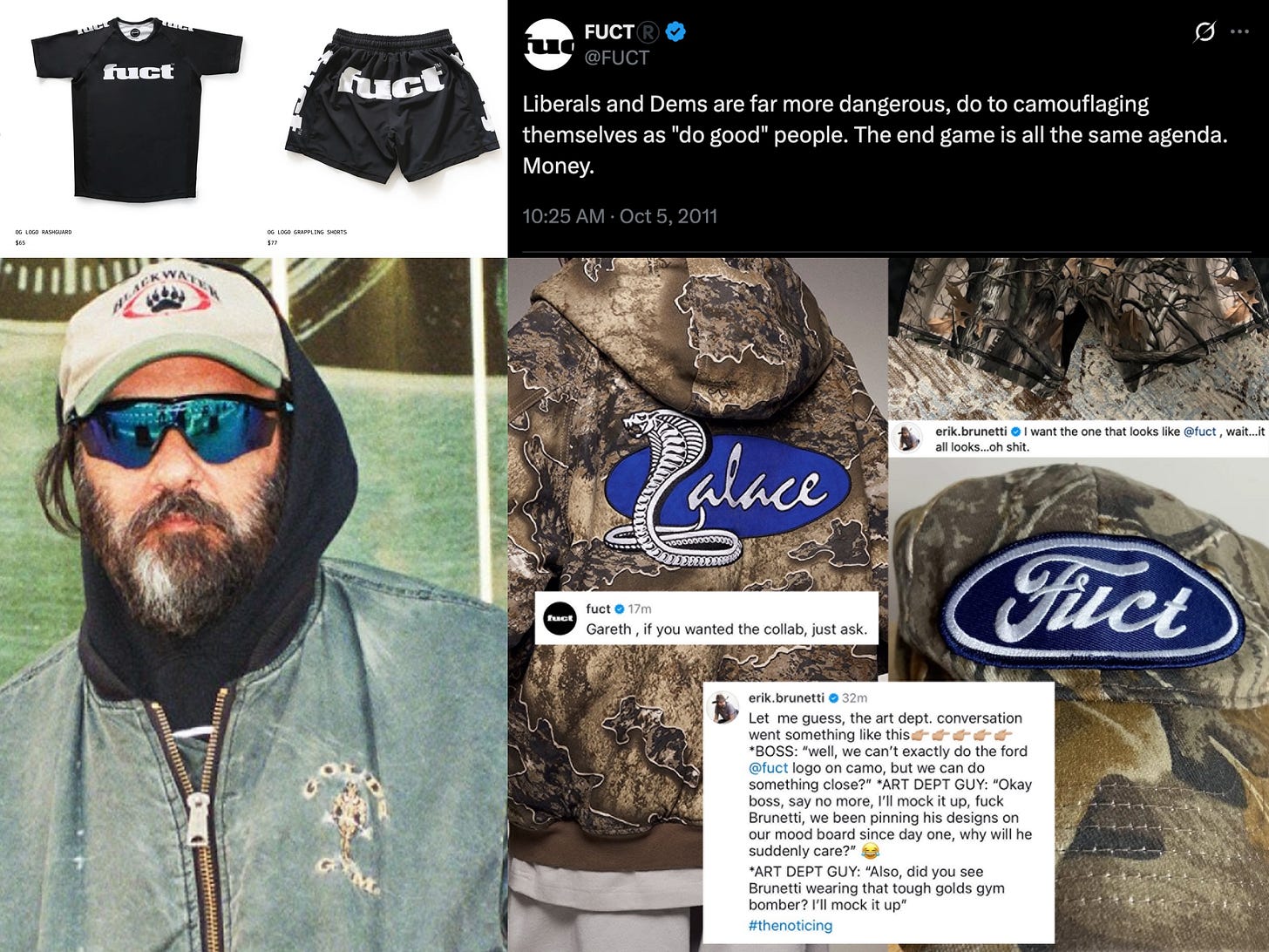 Brunetti has dipped in and out through the years and most recently tried to re-introduce the brand in 2019 with the backing of Ian Michna and Jenkem. That didn’t seem to move the needle with the culture, and perhaps it was the final blow Brunetti needed to fully convert to hard-right victim baby. We didn’t even know Fuct was still around until he fell into the old Social Media Trap that’s gotten so many Fools since the dawn of Twitter. Like many of his contemporaries, Brunetti rode the subversive-to-conservative pipeline and couldn’t help but shout it from the rooftops following Trump’s 2024 election and the resulting monumental and immediate culture shift hard to the right. Fuct’s most recent innovation is MMA fighting clothes, a surefire grift to tap into the lucrative Ignorant Prick market that’s booming thanks to Trump’s deep partnership with purveyor of homoerotic entertainment Dana White. Brunetti’s been very vocal (in comment sections) lately, including calling out Palace for copying his designs (LOL) and tripping about the origins of streetwear (LMAO). But dig even further back and you’ll find him backing Trump’s BullShit about Obama’s citizenship and bashing libs as early as 2011! The Fuct Twitter is chock full of Brunetti opining against liberals! And here’s a really interesting observation!